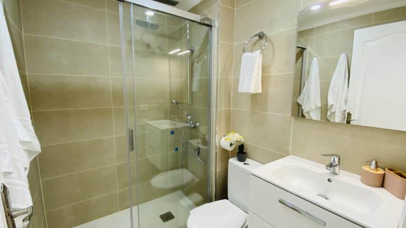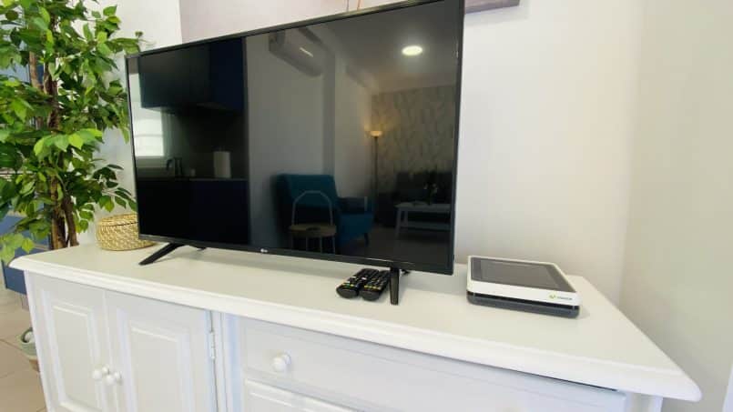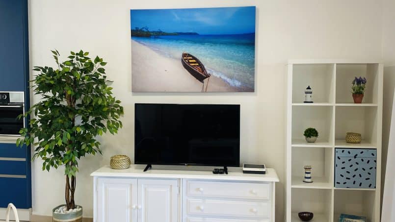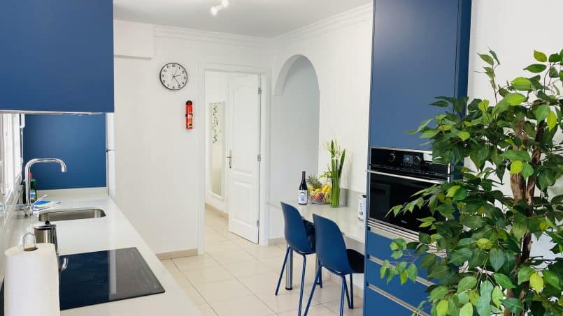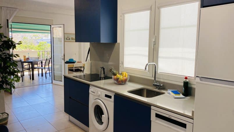 Den har en lille indgang, badeværelse med bruser, 1 soveværelse med to enkeltsenge, der er sat sammen ( men kan skilles ad hvis det ønskes) et lille, men komplet og funktionelt køkken med opvaskemaskine og vaskemaskine, køle-fryseskab, kogeplader, kedel, kaffemaskine og brødrister. Fra køkkenet fortsætter du ind i stuen, der har en stor lejlighed creen smart tv, TRÅDLØST INTERNET, aircondition lille kontor skrivebord og en sovesofa.