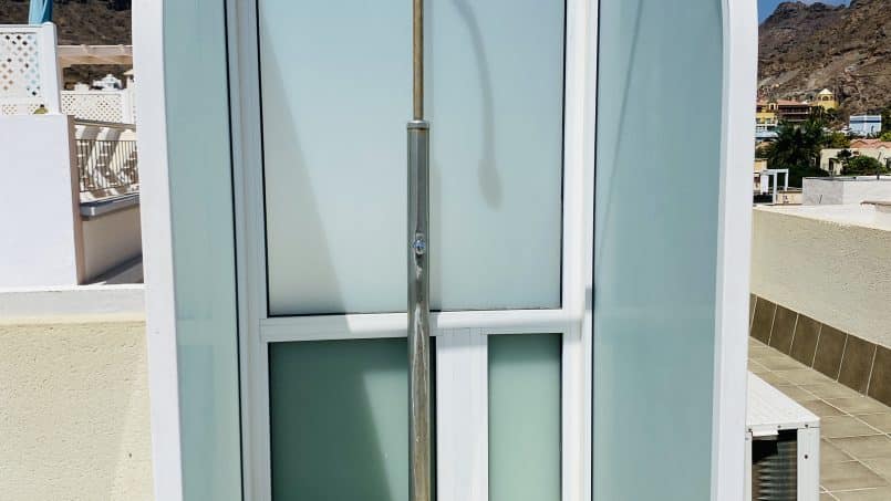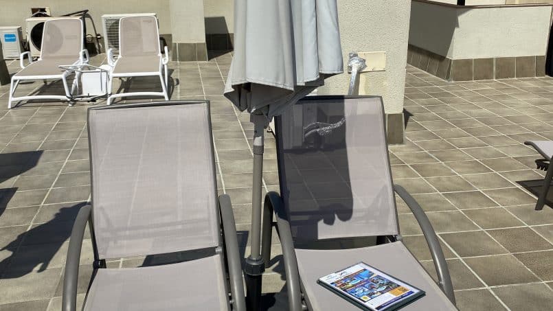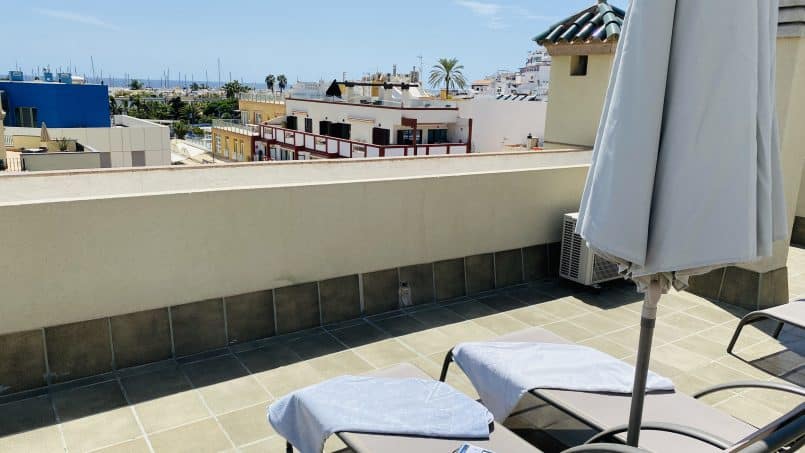 På taget, der er et loungeområde, som gæster kan bruge, at solbade. Der er også en udendørs bruser der.